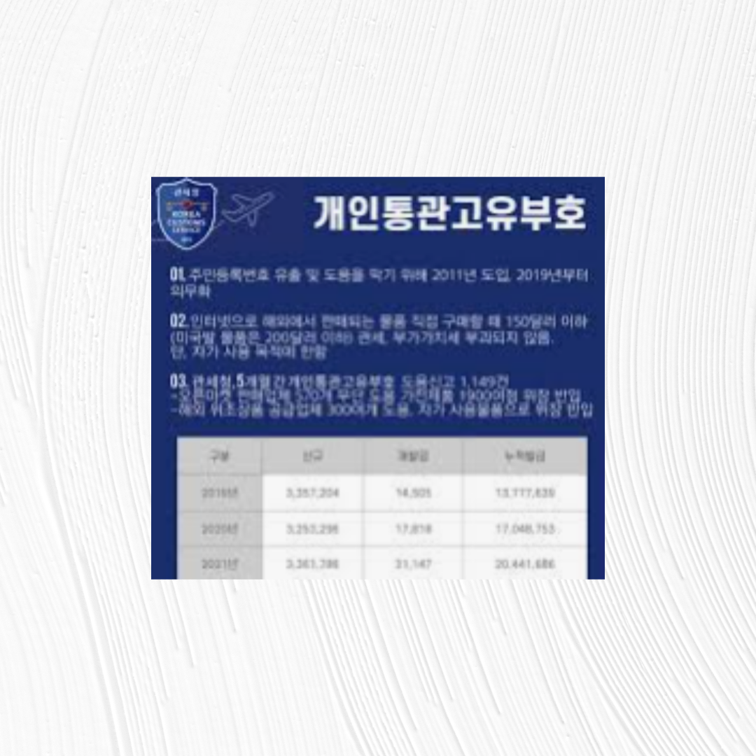 과거에는 주민등록번호를 이용해 수입 신고를 진행했지만, 개인정보 보호 및 보안 강화를 위해 관세청에서 개인통관부호 제도를 도입하였습니다. 이를 통해 개인정보 유출 위험을 줄이고, 세관에서 신속하고 정확한 통관이 가능해졌습니다.